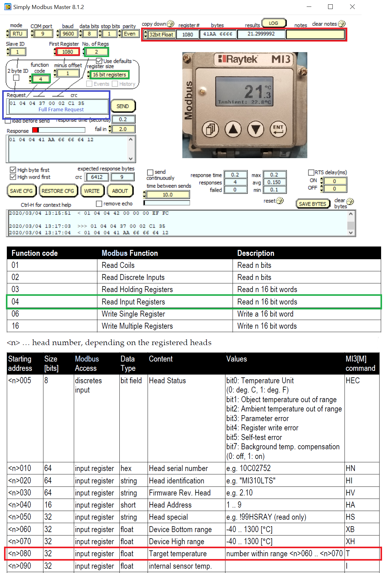In this example, we are polling target temperature of Head 1. In the orange boxed area you can see the full frame request: